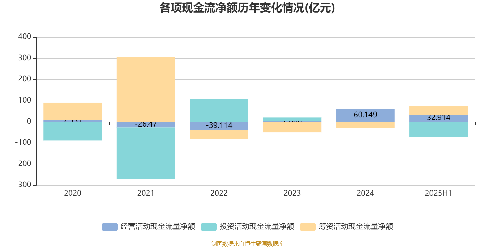 2025年上半年,公司经营活动现金流净额为32.91亿元;筹资活动现金流净额43.03亿元;投资活动现金流净额-71.88亿元。