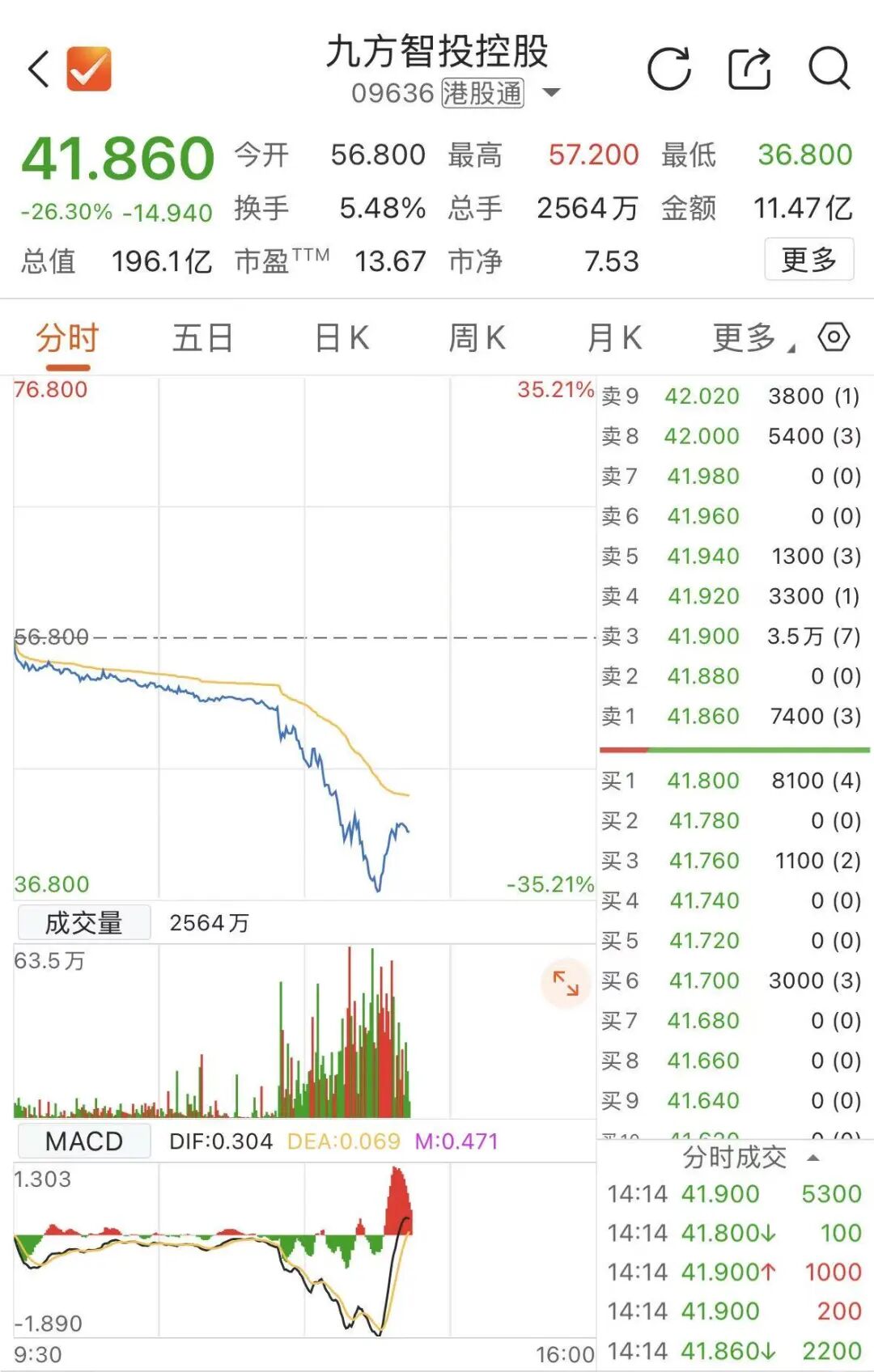 1月26日,九方智投控股午后跳水,一度跌超35%,截至发稿,跌幅有所收窄,最新股价报41.86港元/股,跌26.3%,成交额11.47亿港元。