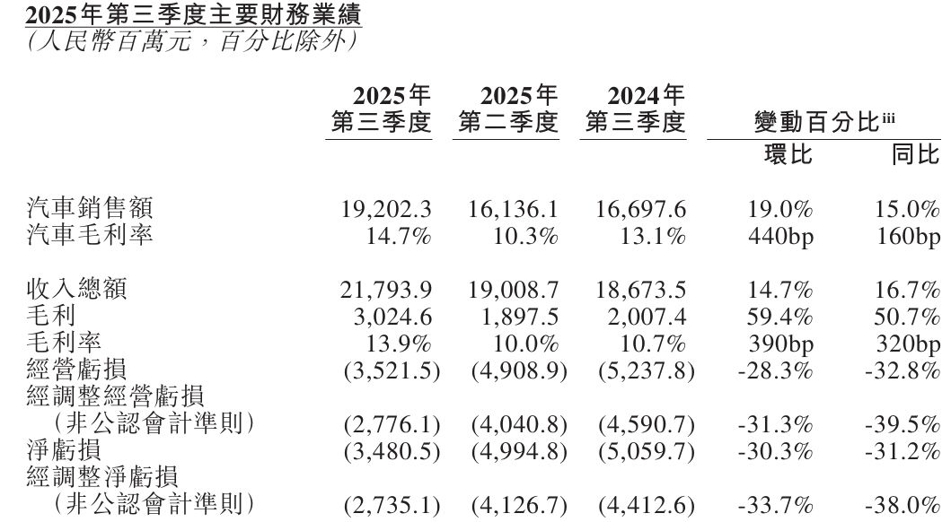 财报显示,蔚来2025年第三季度综合毛利率为13.9%,2024年第三季度为10.7%,2025年第二季度为10%。其中,整车毛利率为14.7%,2024年第三季度为13.1%,2025年第二季度为10.3%。“通过持续优化成本以及高毛利率车型交付占比提升,公司的汽车毛利率在2025年第三季度环比提升至14.7%,综合毛利率达到过去三年来的最高水平,突显产品及服务盈利能力的提升。”蔚来首席财务官曲玉表示。