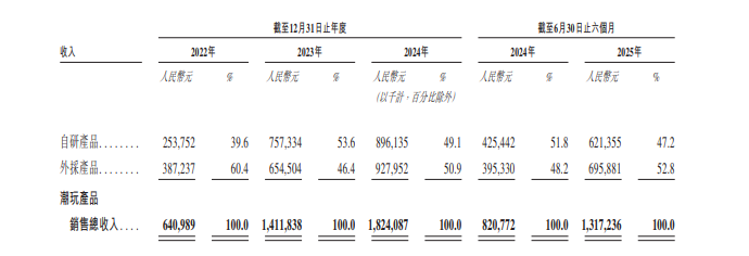 自研产品并非全部是自有IP,根据招股书,自研基础产品由基于自有或授权IP开发的自研产品组成。外采产品即采购自第三方,TOP TOY将外采产品所生成的IP称为他牌IP。截至2025年上半年,公司他牌IP总数超过600个。