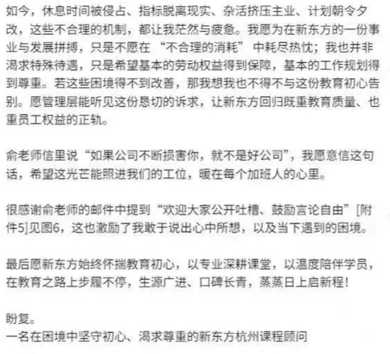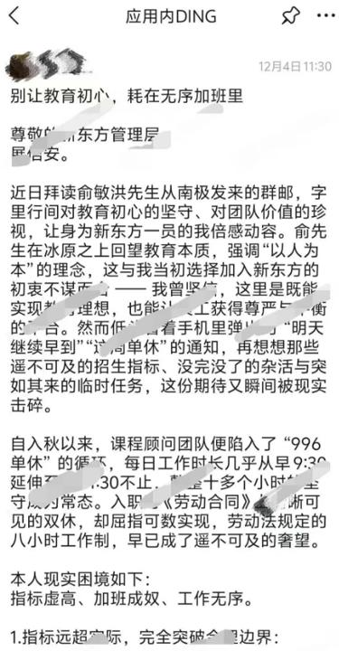该员工是4日11时30分通过钉钉app向新东方全员发送的消息。这名员工写道,“拜读俞敏洪先生从南极发来的群邮,字里行间对教育初心的坚守、对团队价值的珍视,让身为新东方一员的我倍感动容,俞先生在冰原之上回望教育本质,强调‘以人为本’的理念,我曾坚信,这里能让员工获得尊严……然而低头看着手机里弹出的‘明天继续早到’‘这周单休’的通知,再想想那些遥不可及的招生指标、没完没了的杂活与突如其来的临时任务,这份期待又瞬间被现实击碎。”