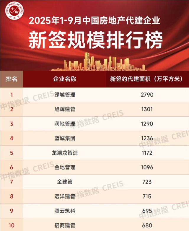 另外,随着地方城投的“下场”,政府代建业务逐渐增长。在政府代建方面,华润置地旗下的润地管理凭借央企优势遥遥领先。2025年1—9月,房地产代建企业积极布局政府代建,从榜单来看,润地管理以810万平方米的新拓面积位列榜单第一。旭辉建管和龙湖龙智造位列二三位,新签约政府代建规模分别为580万平方米和341万平方米。