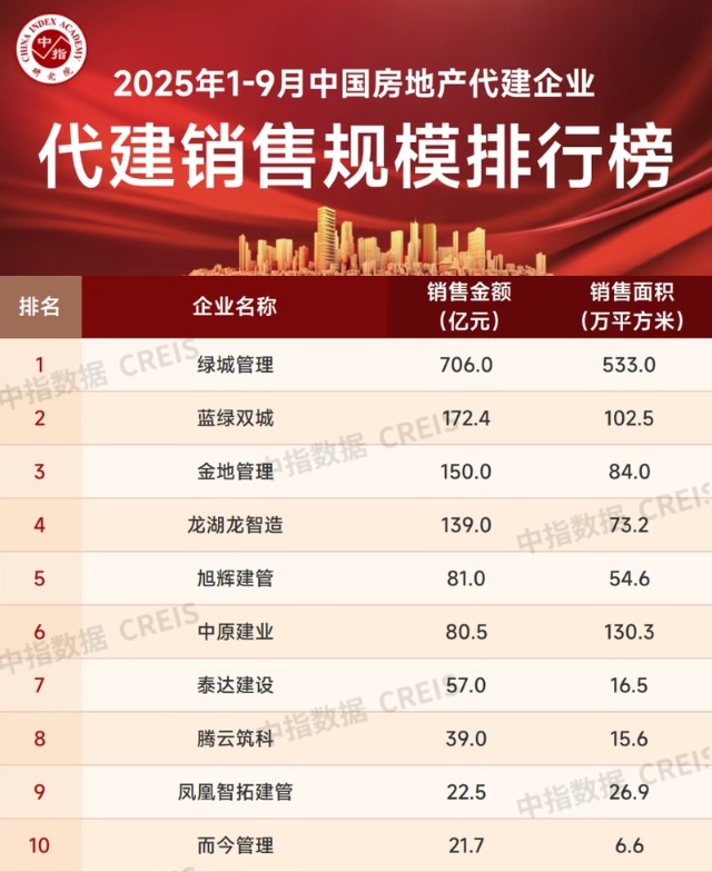 随着入局代建企业增加,代建项目纷纷进入销售阶段。根据中指研究院数据,2025年1—9月,绿城管理以706亿元合约销售金额位列代建销售榜首位。蓝绿双城和金地管理代建项目销售金额分别为172.4亿元和150.0亿元,位列二、三位。