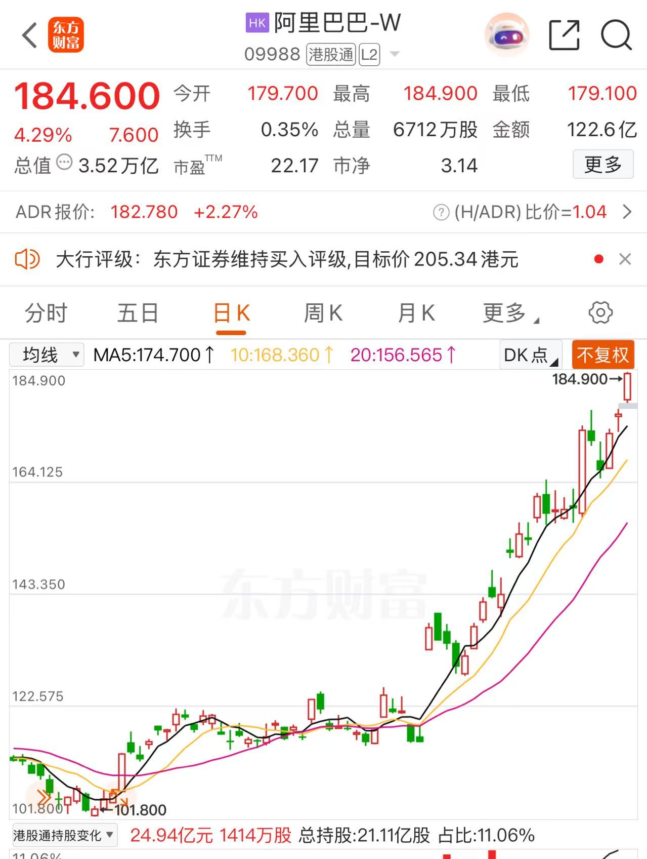 港股异动 | 阿里巴巴-W股价创2021年8月以来新高