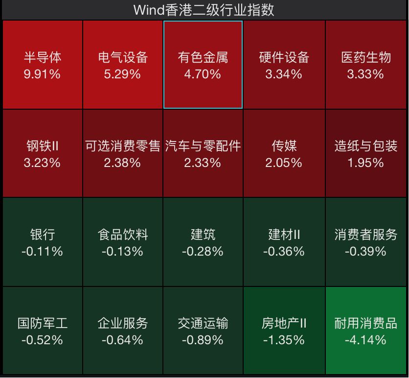 其他方面,盘面上,科网股全线上涨,快手-W(01024.HK)涨超8%,百度集团-SW(09888.HK)涨超4%,京东集团-SW(09618.HK)、小米集团(01810.HK)涨超3%,联想集团(00992.HK)、腾讯(00700.HK)涨超2%,哔哩哔哩-W(09626.HK)、网易-S(09999.HK)、美团-W(03690.HK)涨超1%;黄金股普涨,中国白银集团(00815.HK)涨超30%,紫金黄金国际(02259.HK)涨超14%;锂电池板块涨幅居前,宁德时代(03750.HK)涨超5%创上市新高;创新药概念延续涨势,药明合联(02268.HK)涨超7%;内房股跌幅居前,远洋集团(03377.HK)跌超4%。