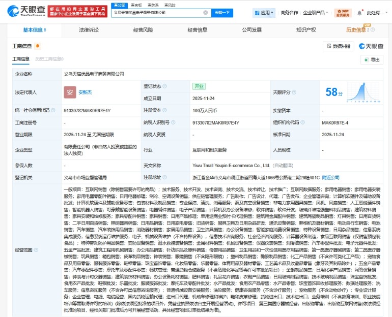 南方财经11月25日电,天眼查工商信息显示,近日,义乌天猫优品电子商务有限公司成立,法定代表人为安新杰,注册资本100万人民币,经营范围含互联网销售、互联网数据服务、家用电器销售、家用电器安装服务、家用电器零配件销售、供应链管理服务、企业管理咨询、计算机软硬件及辅助设备批发等。股权全景穿透图显示,该公司由淘天有限公司全资持股,后者为淘宝(中国)软件有限公司全资子公司。