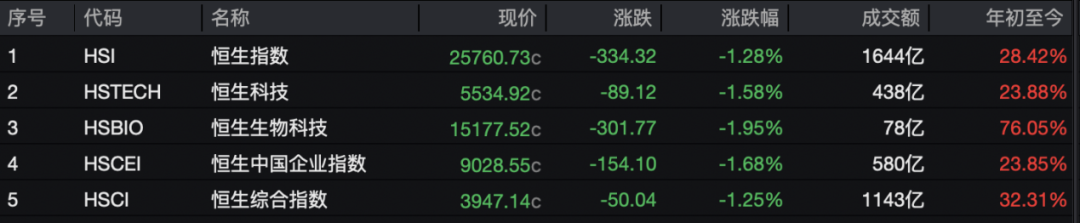 12月3日,港股三大指数齐跌。截至收盘,恒生指数报25760.73点,跌1.28%;恒生国企指数报9028.55点,跌1.68%;恒生科技指数报5534.92点,跌1.58%。全日大市成交额为1644亿港元,南向资金净买入22.79亿港元。