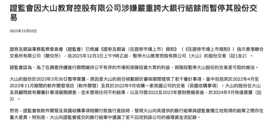 12月3日,香港证券及期货事务监察委员会(以下简称香港证监会)根据相关规则指示香港联合交易所有限公司(联交所),自2025年12月3日上午9时起,暂停大山教育的股份交易。