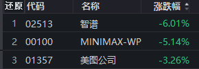 AIGC股走弱,智谱跌超6%,MINIMAX跌超5%,美图公司跌超3%。