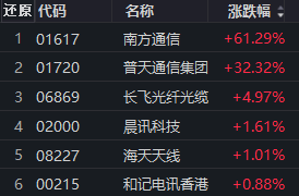 电讯设备概念低开高走,南方通信涨超61%,长飞光纤光缆涨近5%。