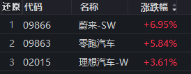 汽车板块涨幅居前,蔚来涨近7%,零跑汽车涨超5%,理想汽车涨超3%。