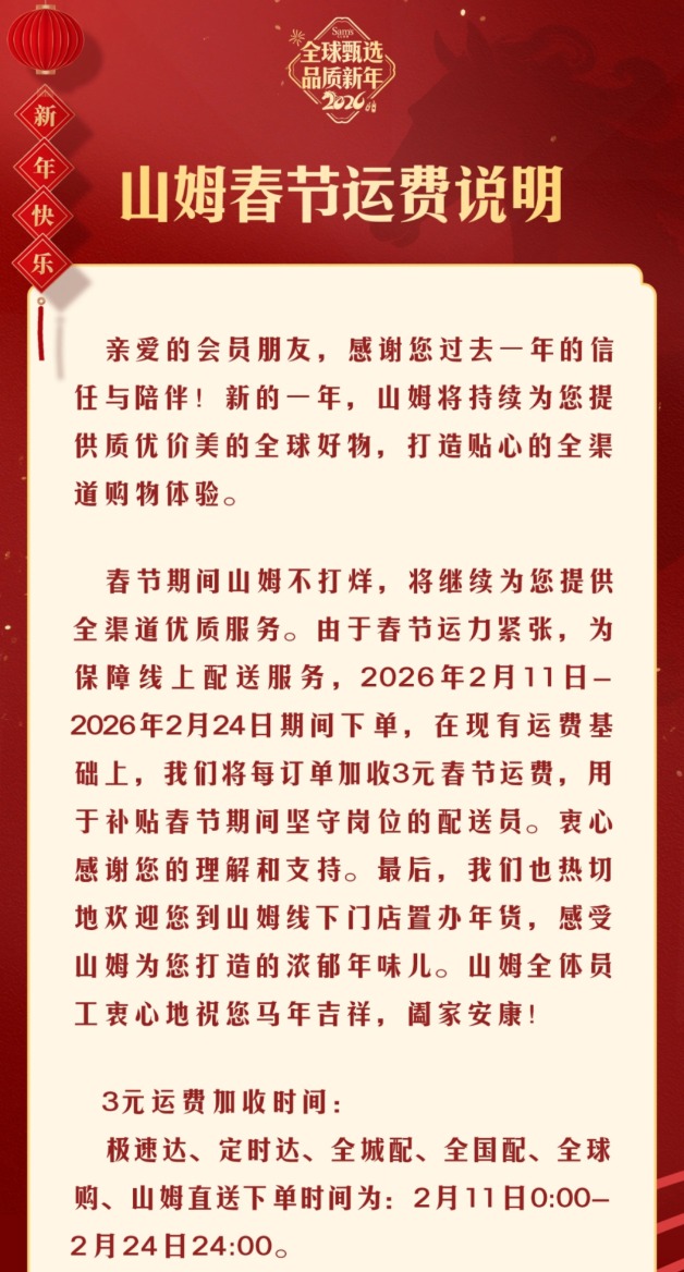 山姆每单加收3元。山姆在春节运费说明中表示,2026年2月11日至2月24日期间下单,山姆线上配送在现有运费基础上将每单加收3元春节运费,用于补贴春节期间坚守岗位的配送员。