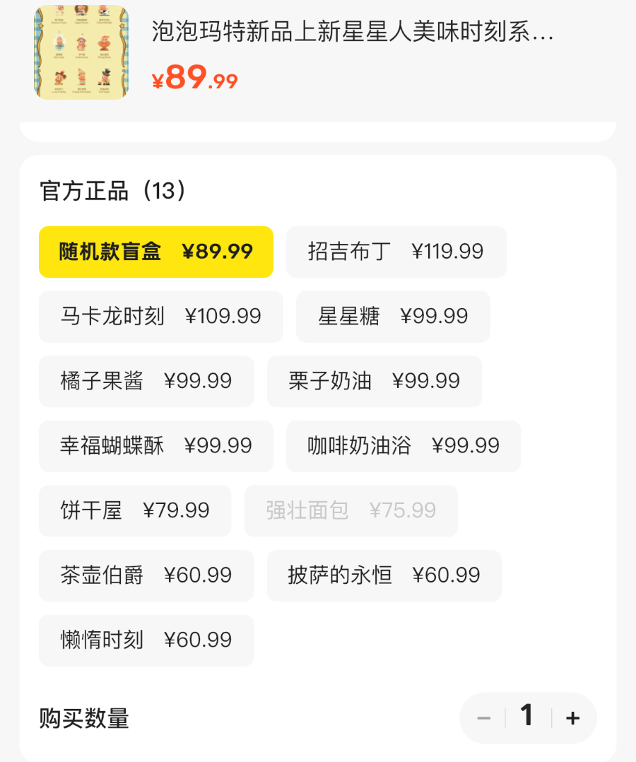 计划于9月29日晚上10点上架的“星星人美味时刻系列盲盒”还未正式发售,在二手电商平台上,该系列包括隐藏款在内的所有产品已有商家挂出链接,且已有不少买家出手预订。
