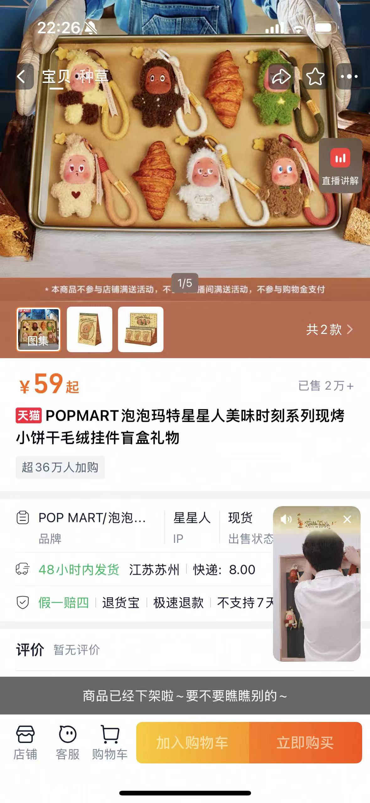 “已经很久很久没有产品在开售前会说卖多少个了,一切以开售情况为准。”正式开抢前,面对诸多关注库存、担心抢不到货的消费者,泡泡玛特天猫官方旗舰店的主播解释道。9月29日晚十点,泡泡玛特“星星人美味时刻系列”线上渠道正式开售,星星人现烤小饼干毛绒挂件和手办盲盒玩具摆件等同时开售。