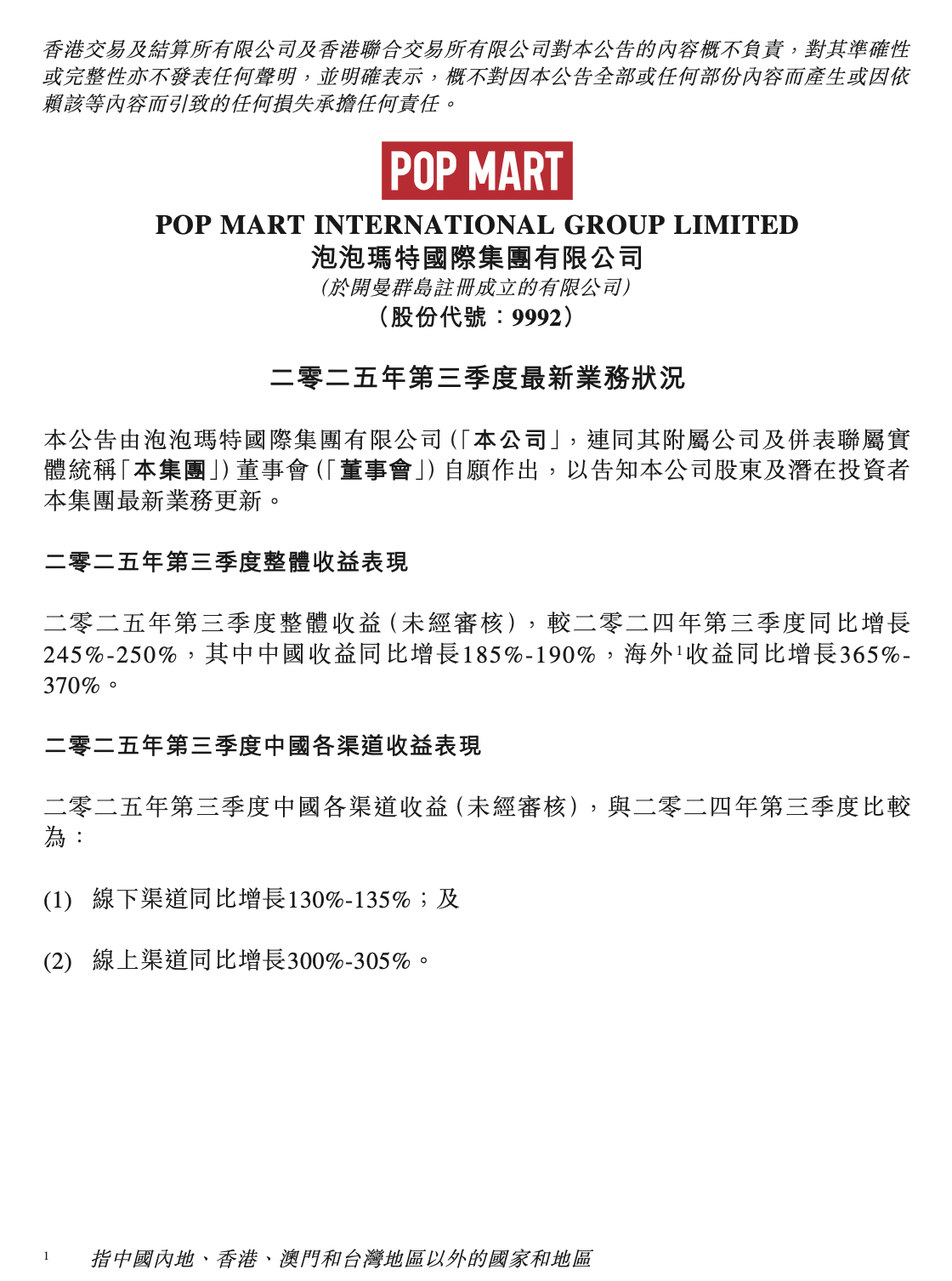 泡泡玛特:第三季度整体收益同比增长245%-250%