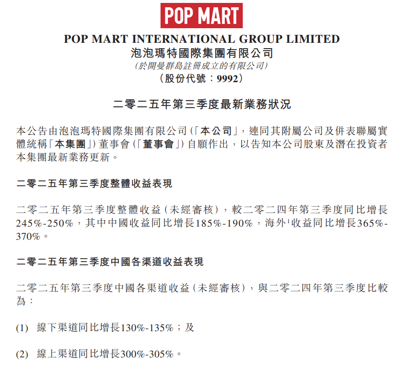 泡泡玛特:三季度整体收益同比预增245%至250%