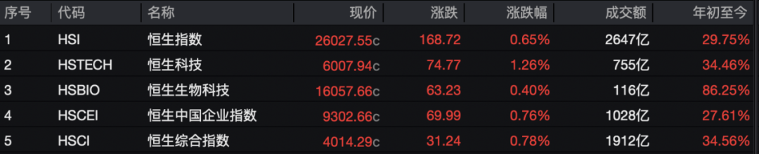10月21日,港股继续强势上攻。恒生指数收涨0.65%,报26027.55点;恒生科技指数收涨1.26%,报6007.94点;恒生中国企业指数收涨0.76%,报9302.66点。全日大市成交额为2647亿港元,较前一交易日略有回升。南向资金净流入11.71亿港元。