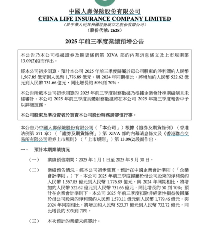 10月21日,中国人寿收涨6.06%。消息面上,10月19日,中国人寿发布盈利预增公告显示,在中国企业会计准则下,该公司2025年前三季度归属于母公司股东的净利润约人民币1567.85亿元到人民币1776.89亿元,同比增长约50%至70%;预计在中国企业会计准则下,该公司2025年前三个季度扣除非经常性损益后归属于母公司股东的净利润约人民币1570.11亿元到人民币1779.46亿元,同比增长约50%~70%。摩根大通称中国人寿基本面方面仍有上行空间。