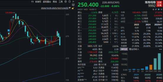 不过,虽然泡泡玛特业绩表现依然亮眼,但在二级市场却遭遇了一些挑战。尤其是在8月底创下339.80港元/股的新高后,近期股价持续调整,10月21日,泡泡玛特股价再次大跌8.08%,高点至今的跌幅已超过26%。