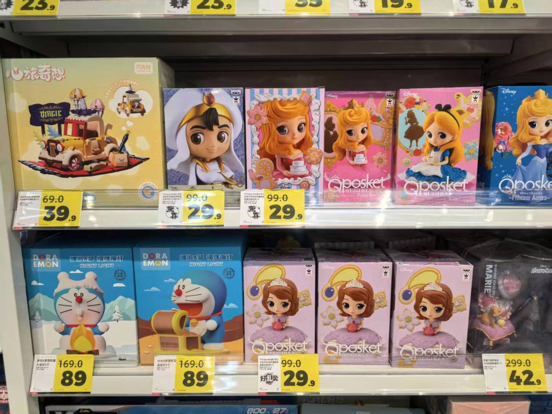 记者走访广州本地商圈发现,在广州荔湾区恒宝广场的好特卖超市的零食货架旁,确实有各式畅销IP盲盒(包括海贼王、蜡笔小新、迪士尼公主系列、叮当等)在低折低价售卖,价格每盒8.8元至39元不等。