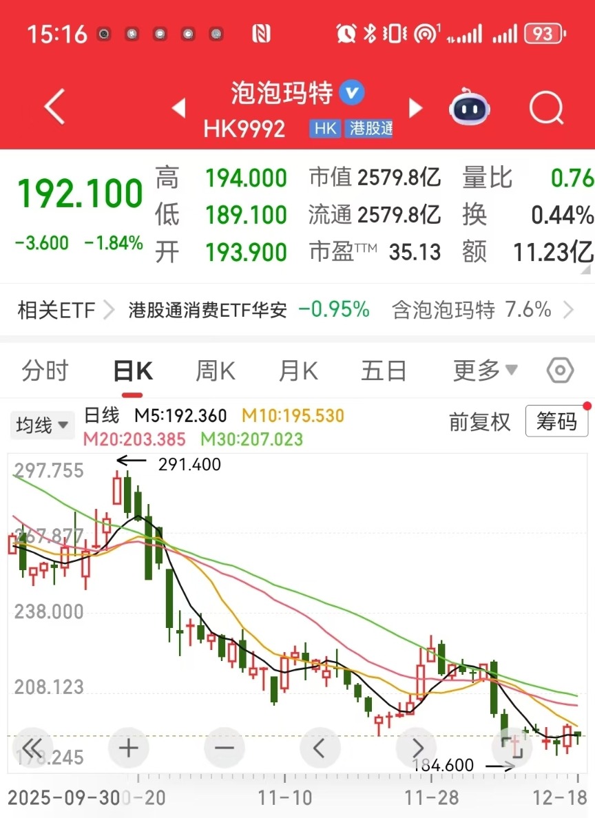 值得一提的是,截至12月9日,泡泡玛特股价下跌,市值蒸发超千亿。截至12月18日发稿前,泡泡玛特股价报192.2港元,最低触及189.1港元,日内跌幅接近2%。