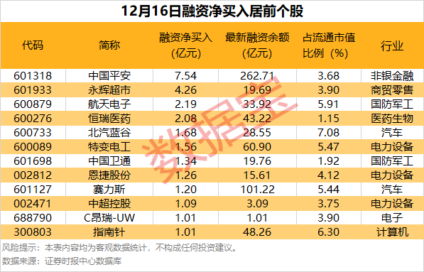 截至12月16日,市场融资余额合计2.49万亿元,较前一交易日减少4.59亿元。具体到个股,12月16日获融资净买入千万元以上的有354只,其中12只融资净买入额超亿元。中国平安融资净买入额居首,当日净买入7.54亿元,其次是永辉超市、航天电子,融资净买入金额分别为4.26亿元、2.19亿元,融资净买入金额居前的还有恒瑞医药、北汽蓝谷、特变电工等。