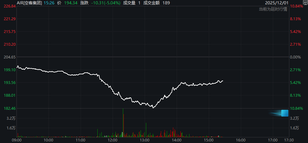 北京时间12月1日晚间,空客集团股价大跌。当天盘中,空客集团德股、法股均一度跌超10%,截至发稿,跌幅收窄至5%左右。