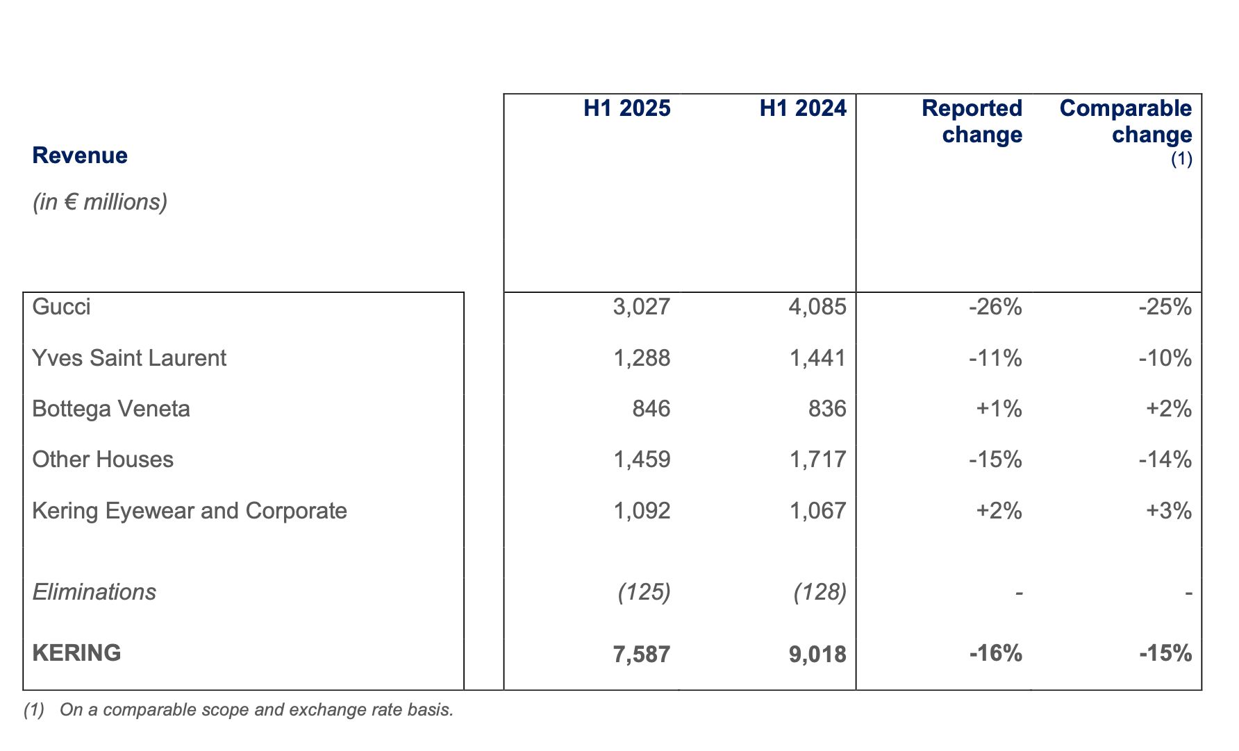 开云集团最新财报显示,今年第二季度,开云集团营收下降15%至37亿欧元,在集团利润中占比最大的Gucci(古驰)营收下降27%至14.6亿欧元。《每日经济新闻》记者注意到,这已是Gucci连续6个季度销售下滑。而在今年上半年,开云集团整体营业收入75.87亿欧元,同比下降16%;经常性营业利润9.69亿欧元,同比下降39%;净利润4.74亿欧元,同比下降46%。与此同时,Gucci营收同比下滑约26%至30.27亿欧元。