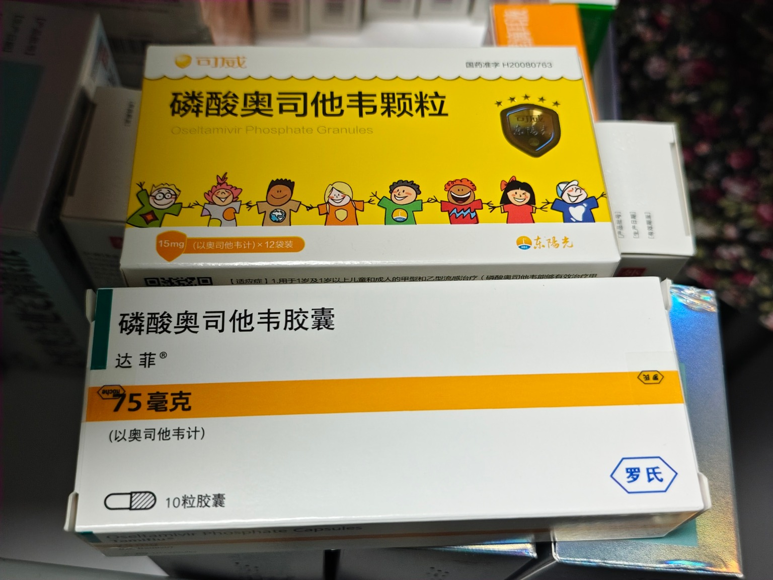 药店在售的奥司他韦原研药“达菲”、国产仿制药“傲菲”、“可威” 图片来源:每经记者林姿辰摄