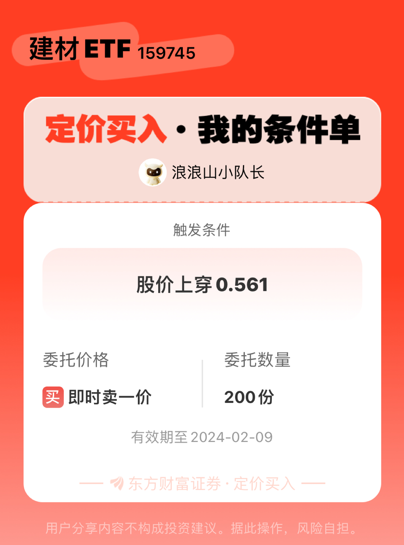 #条件单交流# #定价买入晒单# 一位股神设置了一个条件单,接下来就是见证奇迹的时刻~$建材ETF(SZ159745)$