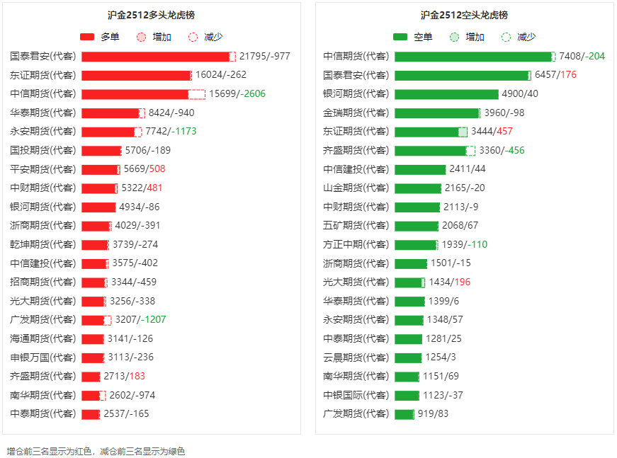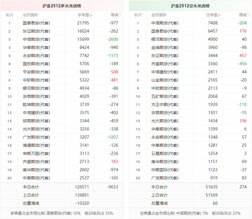 总体而言,沪金2512合约今日减仓上行,多空持仓排名前20席中,多方呈退场态势,空方呈进场态势。