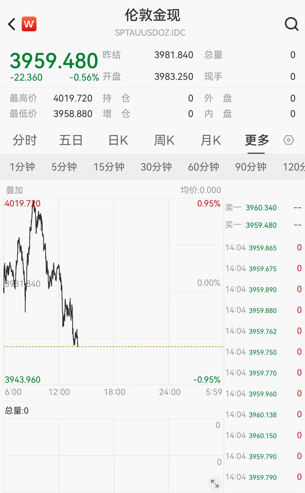 10月28日,现货黄金盘中一度站上4000美元/盎司关口,随后下挫,价格跌破3960美元/盎司。