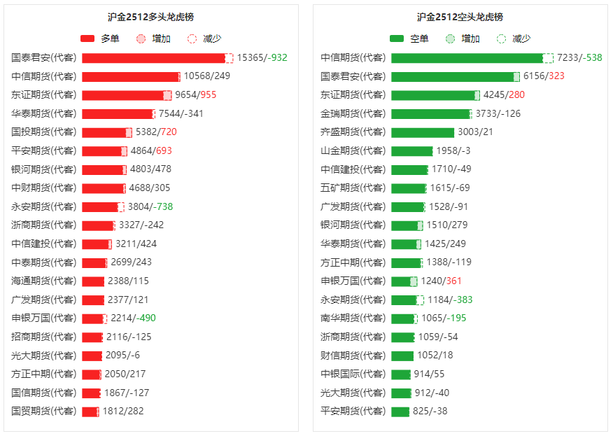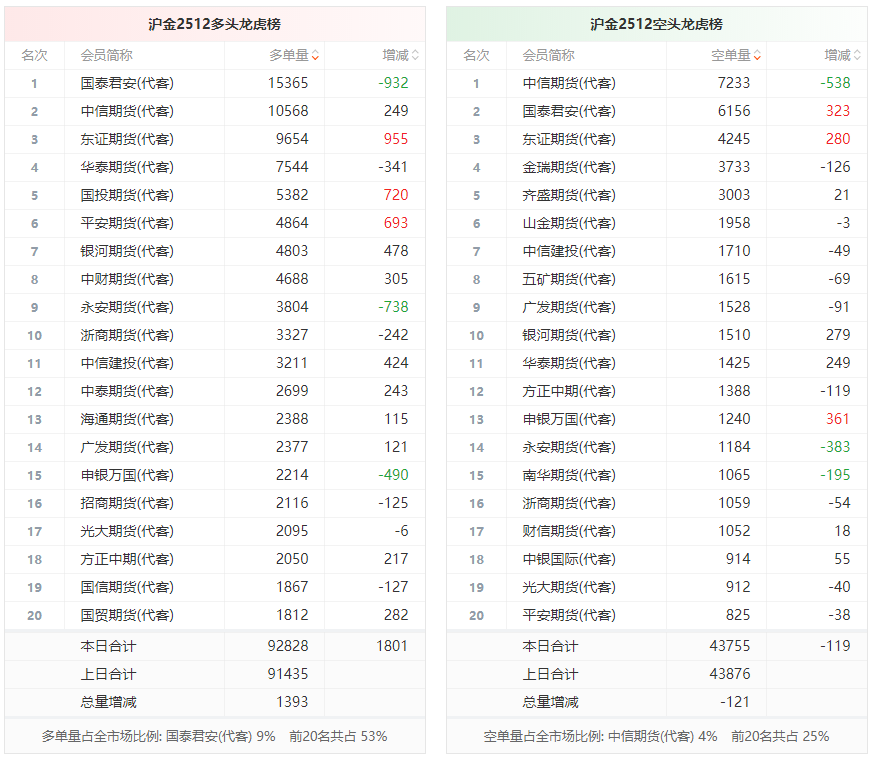 总体而言,沪金2512合约今日减仓下行,多空持仓排名前20席中,多方呈进场态势,空方呈退场态势。