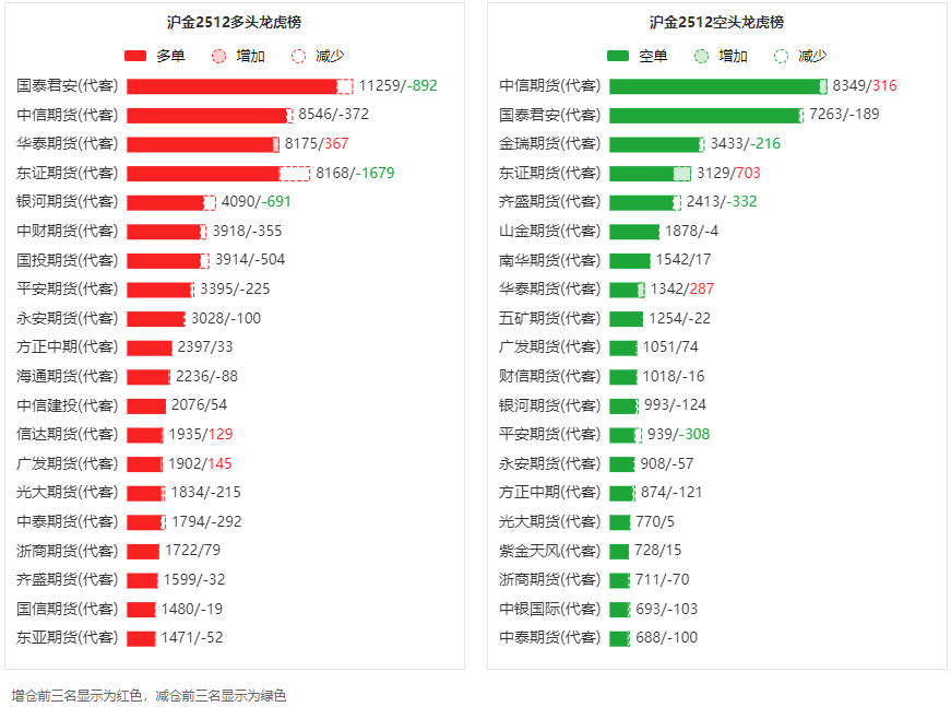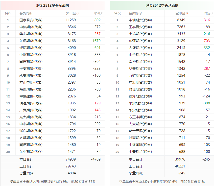 总体而言,沪金2512合约今日减仓上行,多空持仓排名前20席中,多空双方均呈退场态势,多头退场意愿强于空头。