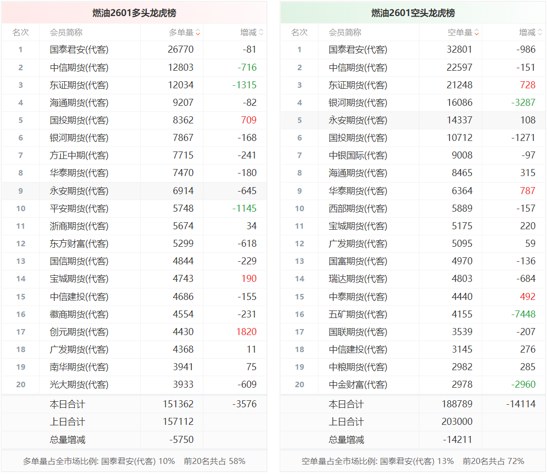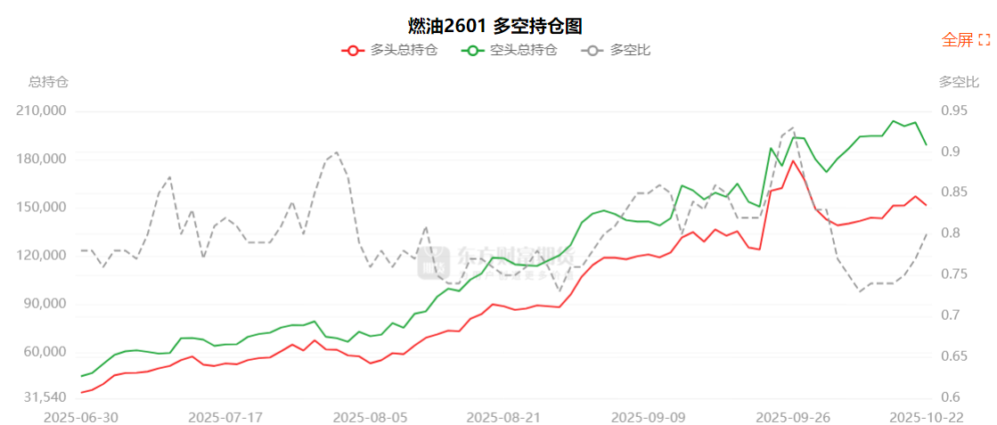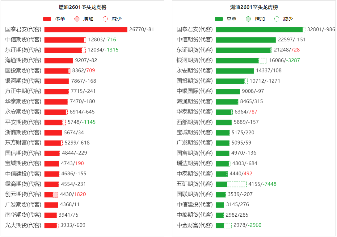 总体而言,燃油2601合约今日减仓上行,多空持仓排名前20席中,多空双方均呈退场态势,多头退场意愿弱于空头。