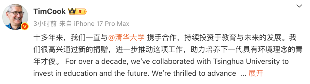 10月14日,苹果公司宣布向清华大学启动一项新的捐赠计划。