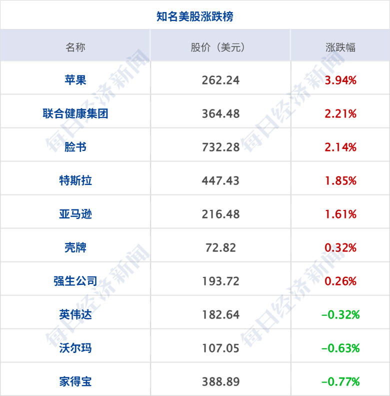 美股高开高走,三大指数均涨超1%,纳指涨1.37%,道指涨1.12%,标普500指数涨1.07%;大型科技股普涨,苹果涨约4%,创历史新高;奈飞涨超3%,英特尔、Meta涨超2%,特斯拉、谷歌、亚马逊涨逾1%,微软小幅上涨;英伟达小幅下跌。纳斯达克中国金龙指数涨2.39%,中概股多数上涨,爱奇艺涨超8%,蔚来涨近5%,金山云涨超4%,阿里巴巴涨近4%,哔哩哔哩、百度涨近2%。