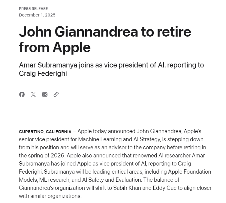 上证报中国证券网讯苹果公司当地时间12月1日宣布,负责机器学习与人工智能战略的高级副总裁吉安南德雷(John Giannandrea)将卸任当前职务,但在2026年春季退休前,他将担任公司顾问。其继任者为曾在谷歌Deepmind和微软工作的知名人工智能研究员阿马尔·萨布拉马尼亚(Amar Subramanya)。萨布拉马尼亚将负责多个关键领域,包括苹果基础模型、机器学习研究以及人工智能安全与评估。