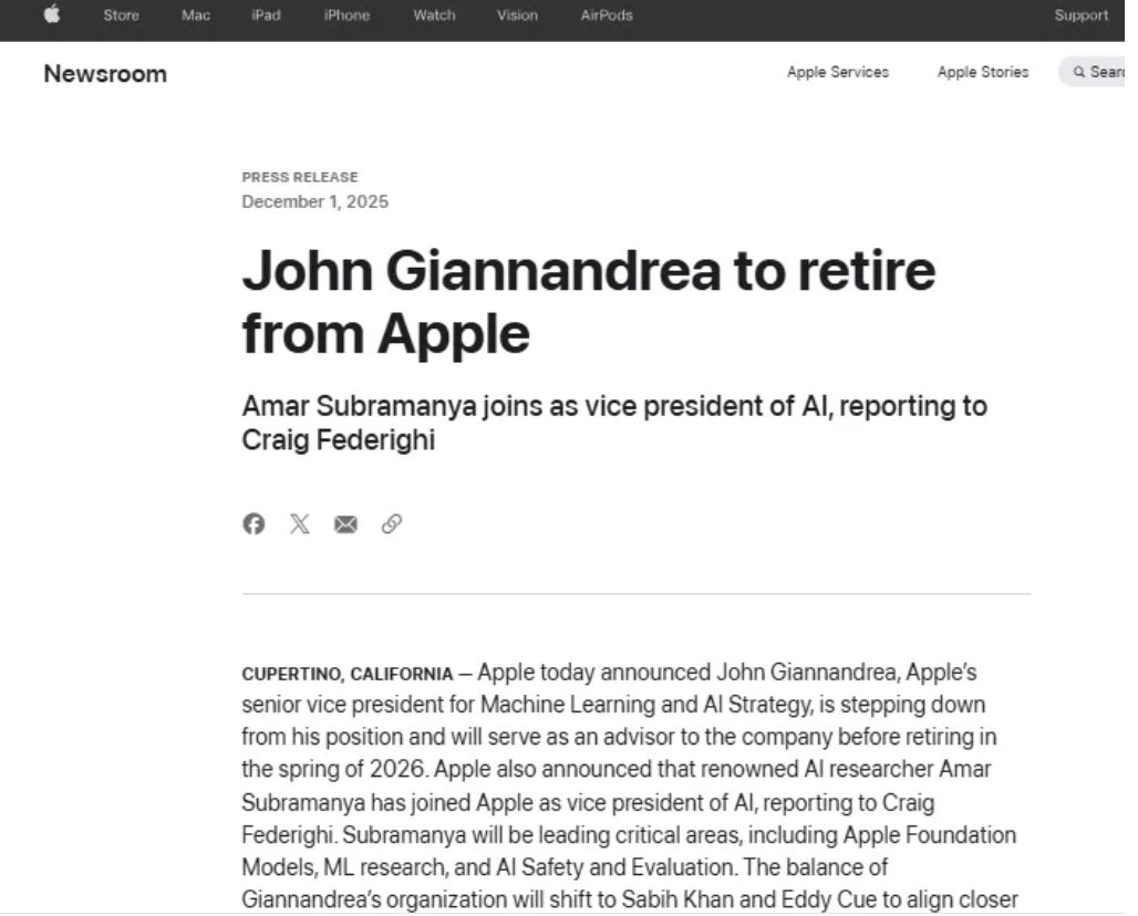 声明称:“我们非常感谢约翰在构建和推进我们的人工智能工作中所发挥的作用,他帮助苹果持续创新,丰富用户的生活。人工智能一直是苹果战略的核心,我们很高兴欢迎阿玛尔加入克雷格的领导团队,并将他卓越的人工智能专业知识带到苹果。”