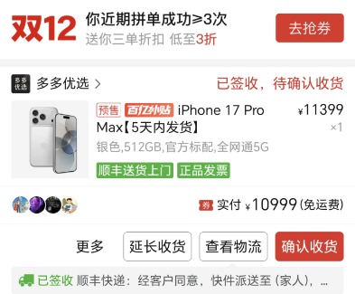 此外,在拼多多百亿补贴平台,优惠力度最大(平台补贴行为),以iPhone 17 Pro Max 512GB为例,其百亿补贴价格低至11399元,相较于官方降价后的11699元更具价格优势,更有幸运消费者在额外获得400元平台补贴红包后,仅以10999元即可购得该机型。