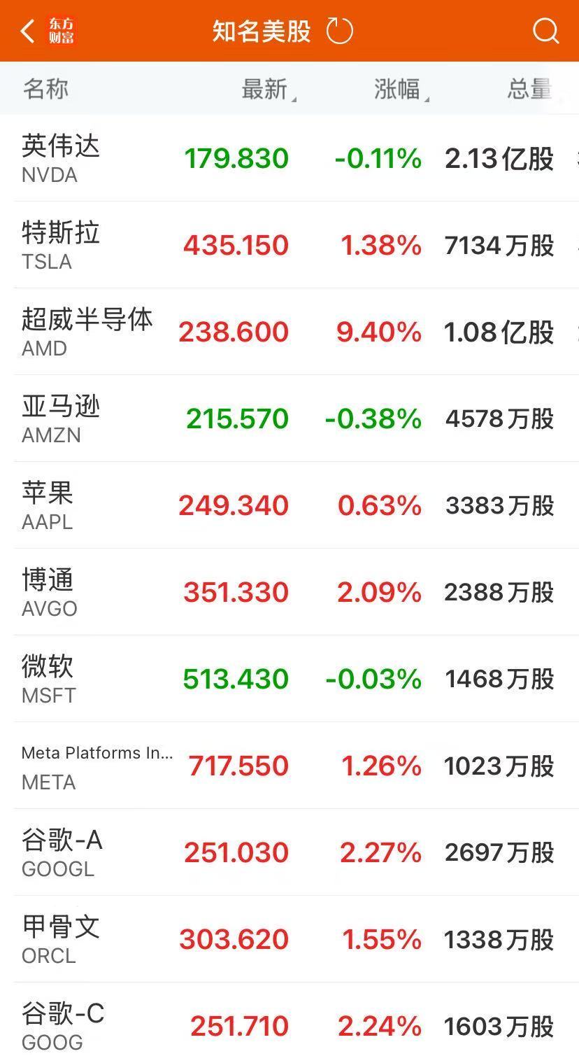 特斯拉涨1.38%,亚马逊跌0.38%,苹果涨0.63%,谷歌A涨2.27%,Meta涨1.26%,芯片巨头AMD大涨9.4%,据新华社消息,当地时间10月6日,OpenAI官网宣布与AMD达成合作协议,将部署总计6GW的AMD GPU算力,价值高达数百亿美元。