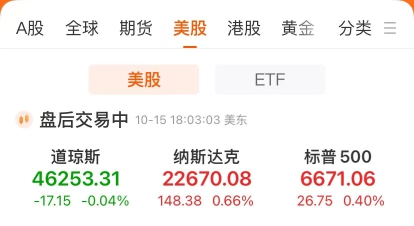 截至收盘,道指跌17.15点,跌幅为0.04%,报46253.31点;纳指涨148.38点,涨幅为0.66%,报22670.08点;标普500指数涨26.75点,涨幅为0.40%,报6671.06点。