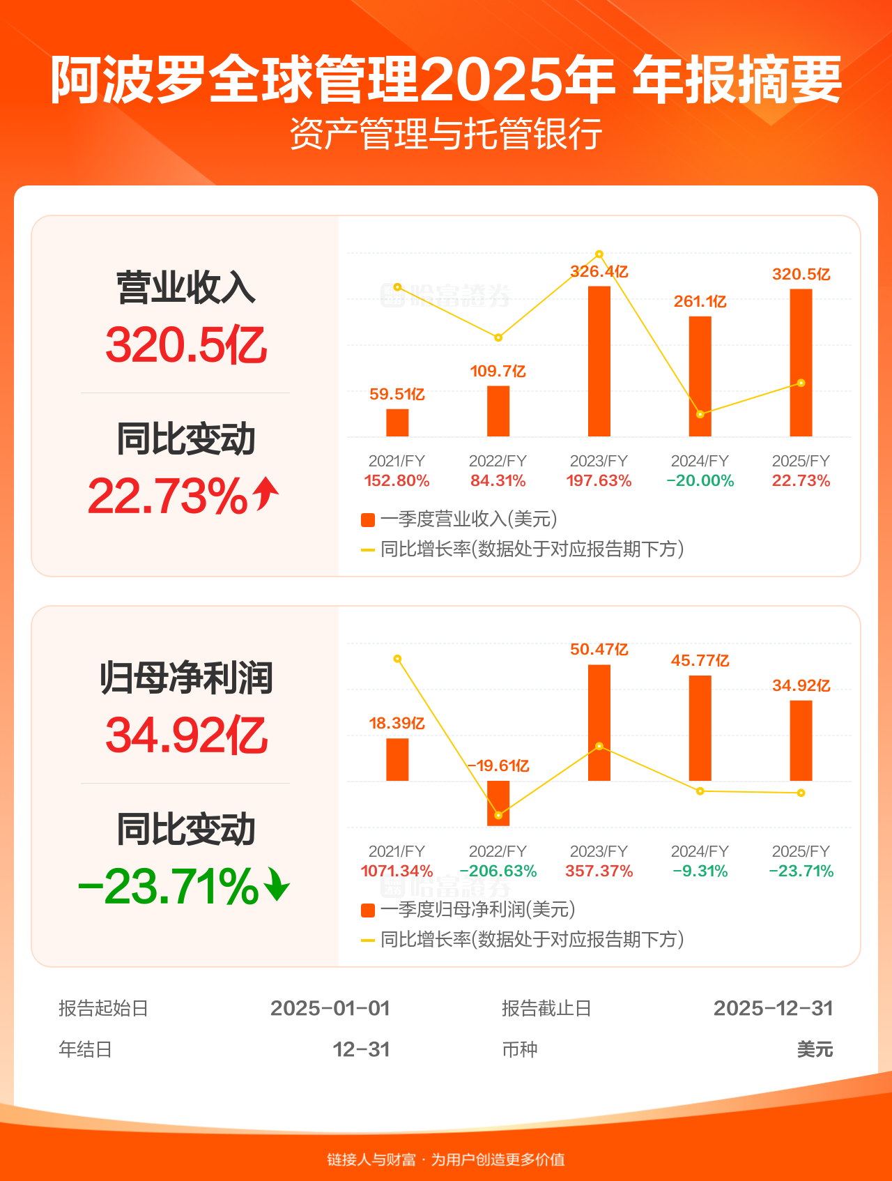 阿波罗全球管理2月9日发布年报业绩,截至2025年12月31日的12个月内,该公司营业收入320.49亿美元,同比增长22.73%;公司权益持有人应占溢利(归母净利润)34.92亿美元,同比减少23.71%。