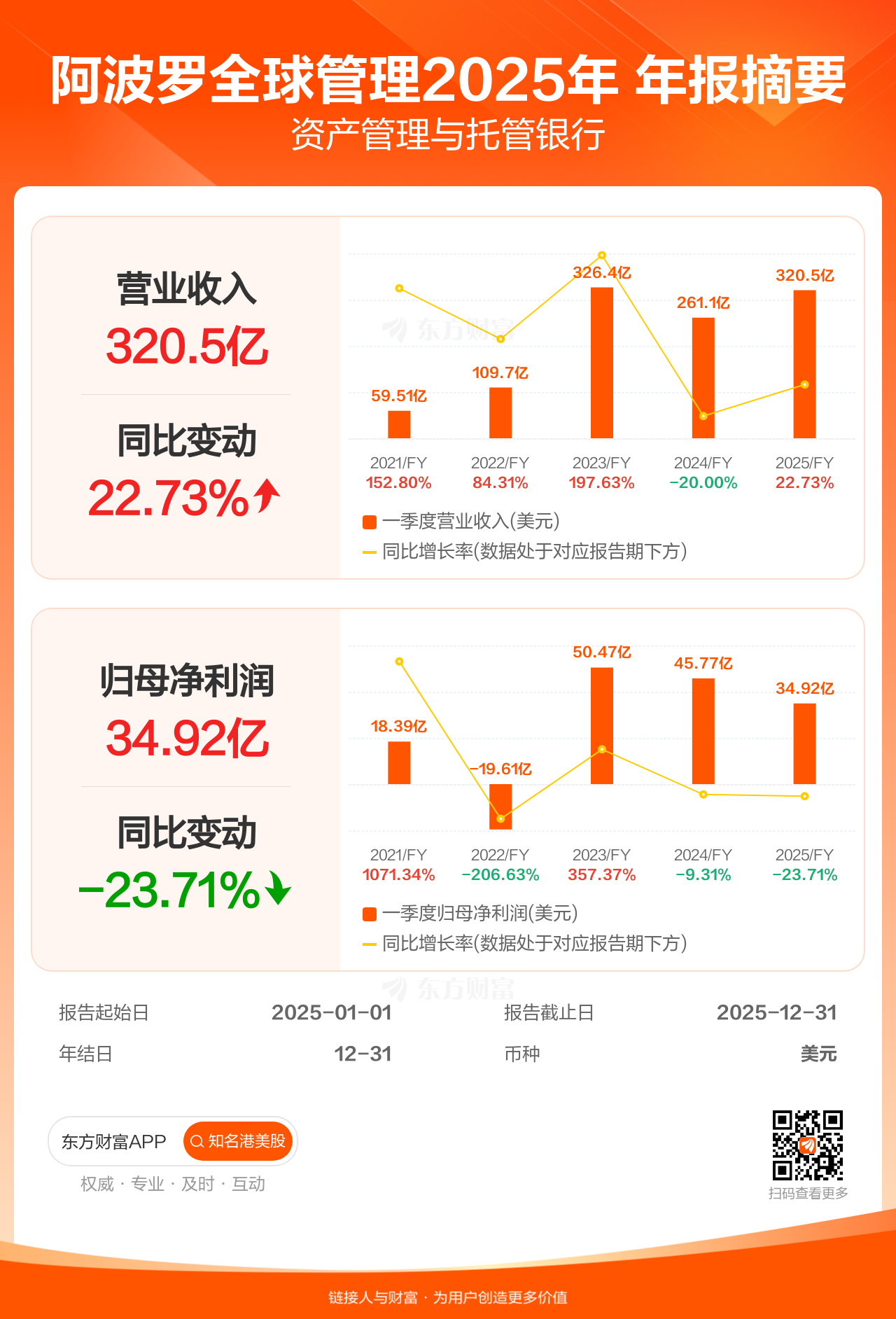 阿波罗全球管理2月9日发布年报业绩,截至2025年12月31日的12个月内,该公司营业收入320.49亿美元,同比增长22.73%;公司权益持有人应占溢利(归母净利润)34.92亿美元,同比减少23.71%。