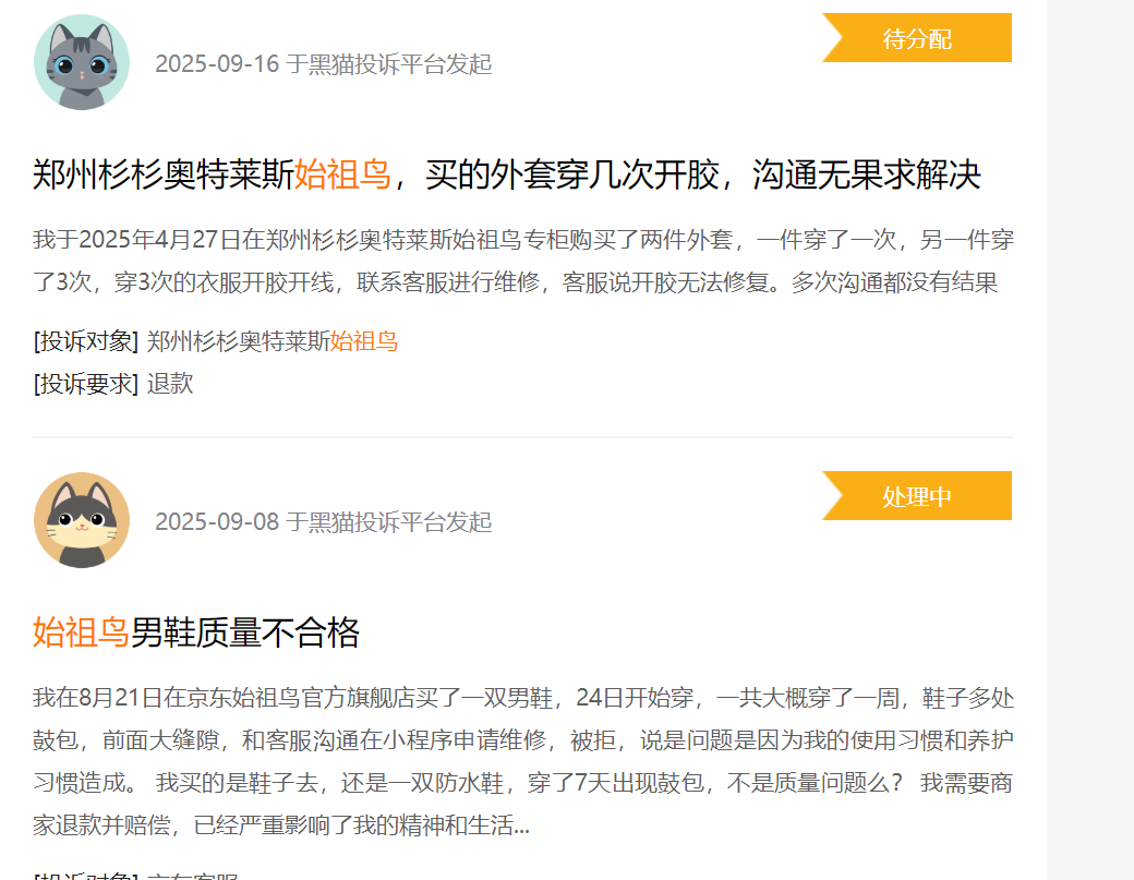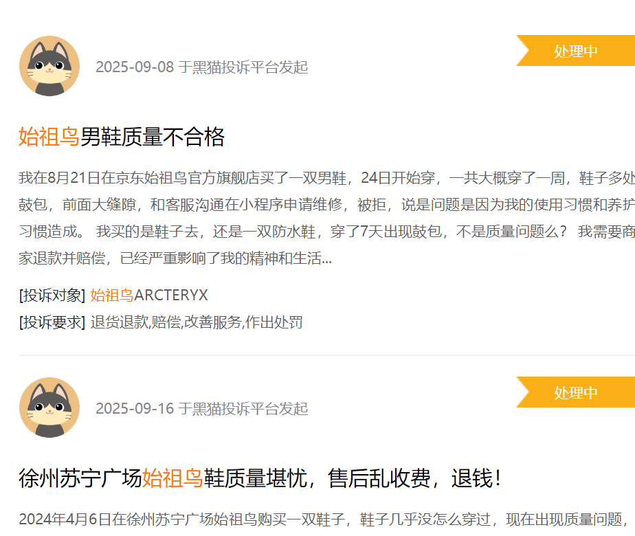 在互联网上,近些年反映始祖鸟的质量存在问题的人多了起来。记者查询搜索黑猫投诉发现,与始祖鸟相关的搜索结果超过3000条,其中不少投诉是关于产品的质量问题的,比如始祖鸟产品存在鞋子开胶、外套鼓包起球、衣服logo脱落等问题。