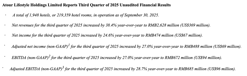 11月25日,中国连锁酒店集团亚朵集团(Atour Lifestyle Holdings Limited,下称“亚朵集团”,NASDAQ:ATAT)披露2025年第三季度业绩报告。