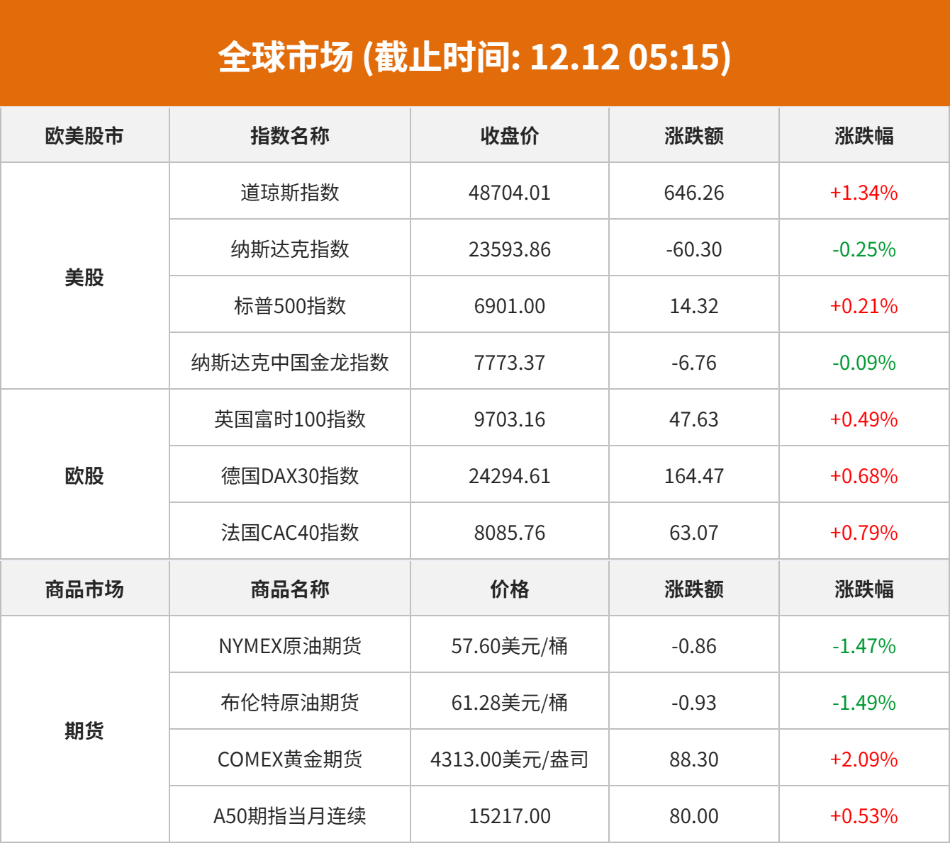 美股市场:美股三大指数12月11日收盘涨跌不一,道指、标普创收盘历史新高。截至收盘,道琼斯工业平均指数比前一交易日上涨646.26点,收于48704.01点,涨幅为1.34%;标准普尔500种股票指数上涨14.32点,收于6901.0点,涨幅为0.21%;纳斯达克综合指数下跌60.3点,收于23593.86点,跌幅为0.25%。