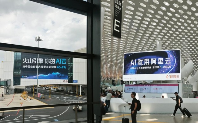 杭州机场的火山引擎广告牌与深圳机场的阿里云广告牌。 新京报贝壳财经记者罗亦丹摄
