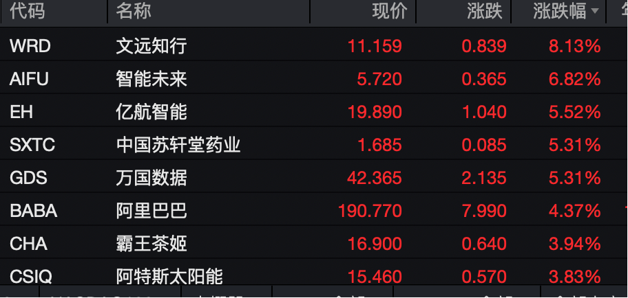 具体个股方面,截至发稿,文远知行涨超8%,智能未来涨超6%,亿航智能、万国数据等涨超5%,阿里巴巴涨超4%。
