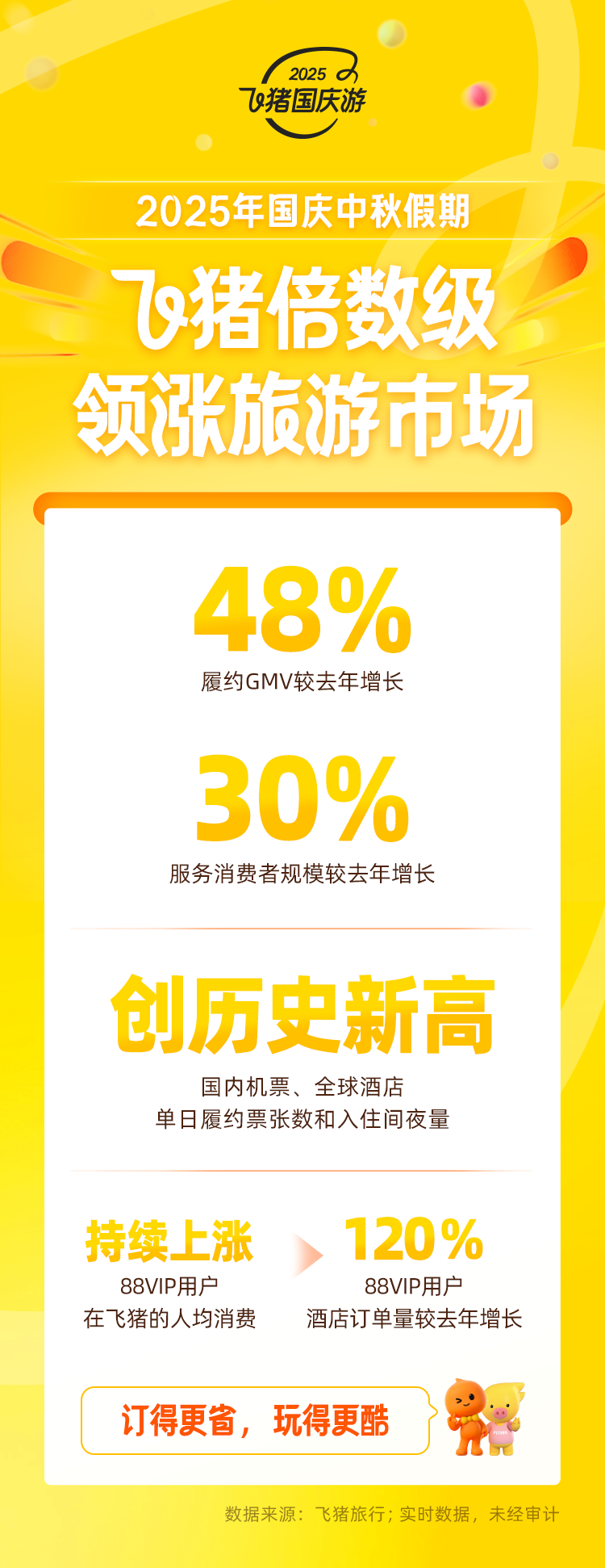 上证报中国证券网讯(记者宋薇萍)10月9日,飞猪宣布,2025年国庆中秋假期,飞猪旅游服务履约GMV较去年增长48%,服务人次较去年增长30%,倍数级领涨旅游市场。